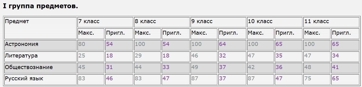 - Пригл. — предварительный балл, необходимый для приглашения на муниципальный этап олимпиады;